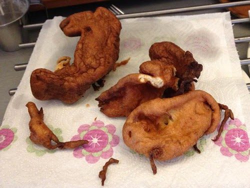 Sitten päästiin vihdoin taikinan pursotteluun. Puristin taikinaa pullosta ananaspurkkiin sopivasti mutkitellen, jolloin rasva alkoi kuohua siihen malliin, etten uskaltanut kovin paljon laittaa. Ekat yritelmät olivat siis aika ohuita kiemurakasoja. Mutta uskalluksen lisääntyessä kikkareet alkoivat jo muistuttaa enemmän tippaleipiä. Sopiva paistoaika riippuu taikinan määrästä ja rasvan kuumuudesta, kaipa siinä muutama minuutti meni per läjä. Sitten kun alkoi näyttää riittävän ruskealta molemmin puolin, nostin tekeleen talouspaperille kuivumaan.